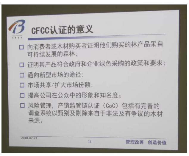 伽立實業集團邀請來自專業機構的培訓講師,任職PEFC和CFCC認證相關崗位長達數十年經驗,對營銷中心及相關部門進行PEFC和CFCC認證培訓指導。